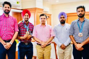 Chandigarh,20 August,2024,(Azad Soch News):- ਪੈਰਿਸ ਓਲੰਪਿਕਸ (Paris Olympics) ’ਚ ਹਾਕੀ ਵਿੱਚ ਕਾਂਸੀ ਤਮਗ਼ਾ ਜੇਤੂ ਪੰਜਾਬ ਦੇ ਦੋ ਪੀ.ਸੀ.ਐਸ. ਅਫਸਰਾਂ ਹਾਰਦਿਕ ਸਿੰਘ ਤੇ ਗੁਰਜੰਟ ਸਿੰਘ ਵੱਲੋਂ ਪੰਜਾਬ ਦੇ ਮੁੱਖ ਸਕੱਤਰ ਅਨੁਰਾਗ ਵਰਮਾ (Punjab Chief Secretary Mr. Anurag Verma) ਨਾਲ ਮੁਲਾਕਾਤ ਕੀਤੀ...