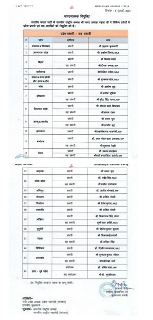 New Delhi,05 July,2024,(Azad Soch News):- ਭਾਜਪਾ ਨੇ ਪੰਜਾਬ ਅਤੇ ਹਰਿਆਣਾ ਸਮੇਤ 24 ਰਾਜਾਂ ਦੇ ਇੰਚਾਰਜ/ਸਹਿ-ਇੰਚਾਰਜ ਨਿਯੁਕਤ ਕੀਤੇ ਹਨ,ਇਸ ਦੀ ਸੂਚੀ ਵੀ ਜਾਰੀ ਕਰ ਦਿੱਤੀ ਗਈ ਹੈ,ਲੋਕ ਸਭਾ ਚੋਣਾਂ (Lok Sabha Elections) ਦੇ ਮੁਕੰਮਲ ਹੋਣ ਤੋਂ ਬਾਅਦ ਭਾਰਤੀ ਜਨਤਾ ਪਾਰਟੀ ਵੱਲੋਂ ਸਾਰੇ ਰਾਜਾਂ ਦੇ ਸੰਗਠਨ ਵਿੱਚ ਬਦਲਾਅ ਕੀਤੇ ਗਏ ਹਨ,ਹਾਲਾਂਕਿ,ਇੱਕ ਵਾਰ ਫਿਰ ਗੁਜਰਾਤ ਦੇ ਸਾਬਕਾ ਸੀਐਮ ਵਿਜੇ ਰੂਪਾਨੀ ਨੂੰ ਪੰਜਾਬ ਦੀ ਜ਼ਿੰਮੇਵਾਰੀ ਦਿੱਤੀ ਗਈ ਹੈ, ਜਦਕਿ ਡਾ: ਨਰਿੰਦਰ ਸਿੰਘ ਨੂੰ ਸਹਿ-ਇੰਚਾਰਜ ਬਣਾਇਆ ਗਿਆ ਹੈ,ਰਾਜ ਸਭਾ ਮੈਂਬਰ ਲਕਸ਼ਮੀਕਾਂਤ ਬਾਜਪਾਈ ਨੂੰ ਝਾਰਖੰਡ ਦਾ ਸੂਬਾ ਇੰਚਾਰਜ ਨਿਯੁਕਤ ਕੀਤਾ ਗਿਆ ਹੈ,ਪਾਰਟੀ ਨੇ ਵਿਨੋਦ ਤਾਵੜੇ ਨੂੰ ਬਿਹਾਰ ਦਾ ਇੰਚਾਰਜ ਅਤੇ ਦੀਪਕ ਪ੍ਰਕਾਸ਼ ਨੂੰ ਸਹਿ-ਇੰਚਾਰਜ ਨਿਯੁਕਤ (Appointed Co-In Charge) ਕੀਤਾ ਹੈ,ਮਹਿੰਦਰ ਸਿੰਘ ਨੂੰ ਮੱਧ ਪ੍ਰਦੇਸ਼ ਦੀ ਕਮਾਨ ਸੌਂਪੀ ਗਈ ਹੈ,ਇਸ ਦੇ ਨਾਲ ਹੀ ਸਤੀਸ਼ ਉਪਾਧਿਆਏ ਨੂੰ ਸਹਿ ਇੰਚਾਰਜ ਬਣਾਇਆ ਗਿਆ ਹੈ।