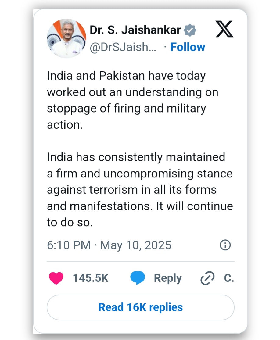 New. Delhi,11,MAY,2025,(Azad Soch News):- ਵਿਦੇਸ਼ ਮੰਤਰੀ ਡਾ. ਐਸ ਜੈਸ਼ੰਕਰ (External Affairs Minister Dr. S Jaishankar) ਨੇ ਟਵੀਟ ਕੀਤਾ, "ਭਾਰਤ ਅਤੇ ਪਾਕਿਸਤਾਨ ਨੇ ਅੱਜ ਗੋਲੀਬਾਰੀ ਰੋਕਣ ਅਤੇ ਫੌਜੀ ਕਾਰਵਾਈ 'ਤੇ ਸਹਿਮਤੀ ਬਣਾਈ ਹੈਭਾਰਤ ਨੇ ਅੱਤਵਾਦ ਦੇ ਸਾਰੇ ਰੂਪਾਂ ਅਤੇ ਪ੍ਰਗਟਾਵੇ ਵਿਰੁੱਧ ਲਗਾਤਾਰ ਇੱਕ ਦ੍ਰਿੜ ਅਤੇ ਸਮਝੌਤਾ ਰਹਿਤ ਰੁਖ਼ ਬਣਾਈ ਰੱਖਿਆ ਹੈ,ਇਹ ਅਜਿਹਾ ਕਰਨਾ ਜਾਰੀ ਰੱਖੇਗਾ।