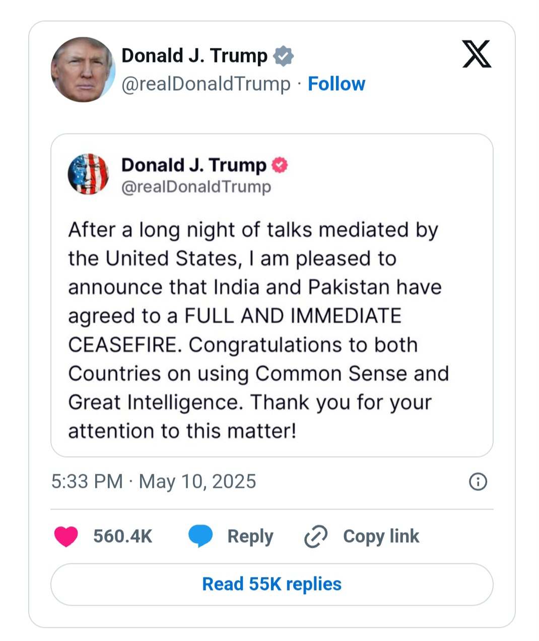 ਭਾਰਤ ਅਤੇ ਪਾਕਿਸਤਾਨ ਵਿਚਕਾਰ ਚੱਲ ਰਹੇ ਤਣਾਅ ਦੇ ਵਿਚਕਾਰ,ਅਮਰੀਕੀ ਰਾਸ਼ਟਰਪਤੀ ਡੋਨਾਲਡ ਟਰੰਪ ਨੇ ਇੱਕ ਵੱਡਾ ਦਾਅਵਾ ਕੀਤਾ