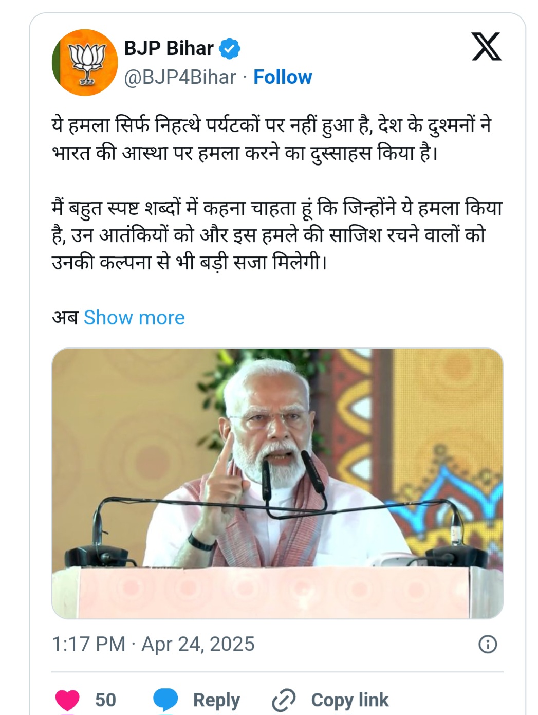 Madhubani,24,APRIL,2025,(Azad Soch News):- ਜੰਮੂ-ਕਸ਼ਮੀਰ ਦੇ ਪਹਿਲਗਾਮ ਵਿੱਚ ਹੋਏ ਅੱਤਵਾਦੀ ਹਮਲੇ ਤੋਂ ਬਾਅਦ, ਪ੍ਰਧਾਨ ਮੰਤਰੀ ਨਰਿੰਦਰ ਮੋਦੀ (Prime Minister Narendra Modi) ਪਹਿਲੀ ਵਾਰ ਬਿਹਾਰ ਦੇ ਮਧੂਬਨੀ ਵਿੱਚ ਇੱਕ ਇਕੱਠ ਨੂੰ ਸੰਬੋਧਨ ਕਰ ਰਹੇ ਹਨ। ਇਸ ਤੋਂ ਪਹਿਲਾਂ, ਬੁੱਧਵਾਰ ਨੂੰ ਪ੍ਰਧਾਨ ਮੰਤਰੀ ਮੋਦੀ ਦੀ ਪ੍ਰਧਾਨਗੀ ਹੇਠ ਸੁਰੱਖਿਆ ਮਾਮਲਿਆਂ 'ਤੇ ਕੈਬਨਿਟ ਮੀਟਿੰਗ (Cabinet Meeting) ਹੋਈ। ਪਹਿਲਗਾਮ ਅੱਤਵਾਦੀ ਹਮਲੇ ਤੋਂ ਬਾਅਦ, ਪ੍ਰਧਾਨ ਮੰਤਰੀ ਸਾਊਦੀ ਅਰਬ ਦੀ ਆਪਣੀ ਯਾਤਰਾ ਵਿਚਕਾਰ ਛੱਡ ਕੇ ਦੇਸ਼ ਵਾਪਸ ਪਰਤ ਆਏ।22 ਅਪ੍ਰੈਲ ਨੂੰ ਪਹਿਲਗਾਮ ਵਿੱਚ ਅੱਤਵਾਦੀਆਂ ਨੇ ਜਿਸ ਬੇਰਹਿਮੀ ਨਾਲ ਮਾਸੂਮ ਦੇਸ਼ਵਾਸੀਆਂ ਨਾਲ ਮੁਲਾਕਾਤ ਕੀਤੀ ਹੈ, ਉਸ ਤੋਂ ਦੇਸ਼ ਵਾਸੀ ਦੁਖੀ ਅਤੇ ਦੁਖੀ ਹਨ। ਪੂਰਾ ਦੇਸ਼ ਮ੍ਰਿਤਕਾਂ ਦੇ ਪਰਿਵਾਰਾਂ ਦੇ ਨਾਲ ਖੜ੍ਹਾ ਹੈ। ਇਹ ਯਕੀਨੀ ਬਣਾਉਣ ਲਈ ਯਤਨ ਜਾਰੀ ਹਨ ਕਿ ਜ਼ਖਮੀ ਜਲਦੀ ਠੀਕ ਹੋ ਜਾਣ। ਅੱਤਵਾਦੀ ਹਮਲੇ ਵਿੱਚ ਕਿਸੇ ਨੇ ਆਪਣਾ ਪੁੱਤਰ ਗੁਆ ਦਿੱਤਾ ਹੈ, ਕਿਸੇ ਨੇ ਆਪਣਾ ਭਰਾ ਅਤੇ ਕਿਸੇ ਨੇ ਆਪਣਾ ਜੀਵਨ ਸਾਥੀ।