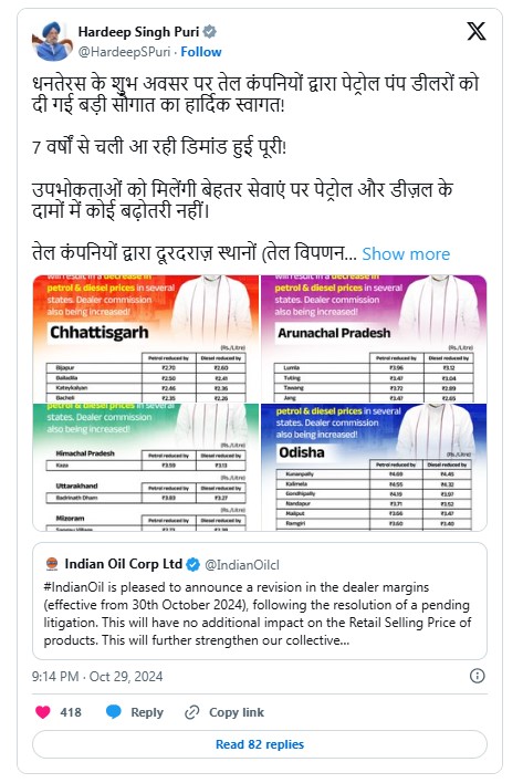 New Delhi,30 OCT,2024,(Azad Soch News):- ਮੋਦੀ ਸਰਕਾਰ ਨੇ ਦੀਵਾਲੀ ਤੋਂ ਪਹਿਲਾਂ ਪੈਟਰੋਲ ਅਤੇ ਡੀਜ਼ਲ (Petrol And Diesel) ਦੀਆਂ ਕੀਮਤਾਂ ਨੂੰ ਲੈ ਕੇ ਵੱਡਾ ਐਲਾਨ ਕੀਤਾ ਹੈ,ਸਰਕਾਰ ਨੇ ਇਕ ਖਾਸ ਫੈਸਲਾ ਲਿਆ ਹੈ,ਜਿਸ ਕਾਰਨ ਪੈਟਰੋਲ-ਡੀਜ਼ਲ ਦੀਆਂ ਕੀਮਤਾਂ 'ਚ 5 ਰੁਪਏ ਤੱਕ ਦੀ ਕਟੌਤੀ ਹੋਵੇਗੀ, ਦਰਅਸਲ, ਸਰਕਾਰ ਨੇ ਡੀਲਰ ਕਮਿਸ਼ਨ ਨੂੰ ਸੋਧਣ ਅਤੇ ਅੰਤਰ-ਰਾਜੀ ਮਾਲ ਢੋਆ-ਢੁਆਈ ਨੂੰ ਤਰਕਸੰਗਤ ਬਣਾਉਣ ਦਾ ਫੈਸਲਾ ਕੀਤਾ ਹੈ,ਇਸ ਫੈਸਲੇ ਤੋਂ ਬਾਅਦ ਰਿਫਾਇਨਰੀ ਰੇਲ (Refinery Rail) ਅਤੇ ਸੜਕ ਰਾਹੀਂ ਆਸਾਨੀ ਨਾਲ ਜੁੜ ਜਾਵੇਗੀ,ਜਿਸ ਕਾਰਨ ਇੱਕ ਰਾਜ ਤੋਂ ਦੂਜੇ ਰਾਜ ਨੂੰ ਤੇਲ ਦੀ ਸਪਲਾਈ ਆਸਾਨ ਹੋ ਜਾਵੇਗੀ,ਇਸ ਨਾਲ ਖਾਸ ਤੌਰ 'ਤੇ ਦੂਰ-ਦੁਰਾਡੇ ਦੇ ਇਲਾਕਿਆਂ 'ਚ ਕੀਮਤਾਂ 'ਚ ਕਮੀ ਆਵੇਗੀ,ਇਹ ਫੈਸਲਾ ਚੋਣ ਰਾਜਾਂ ਨੂੰ ਛੱਡ ਕੇ ਬੁੱਧਵਾਰ ਤੋਂ ਪੂਰੇ ਦੇਸ਼ ਵਿੱਚ ਲਾਗੂ ਹੋਵੇਗਾ,ਕੇਂਦਰੀ ਮੰਤਰੀ ਨੇ ਐਕਸ 'ਤੇ ਪੋਸਟ ਕਰਕੇ ਲਿਖਿਆ-ਧਨਤੇਰਸ (Dhanteras) ਦੇ ਸ਼ੁਭ ਮੌਕੇ 'ਤੇ ਤੇਲ ਕੰਪਨੀਆਂ ਵੱਲੋਂ ਪੈਟਰੋਲ ਪੰਪ ਡੀਲਰਾਂ (Petrol Pump Dealers) ਨੂੰ ਦਿੱਤਾ ਗਿਆ ਵੱਡਾ ਤੋਹਫਾ,ਸੱਤ ਸਾਲਾਂ ਤੋਂ ਚੱਲੀ ਆ ਰਹੀ ਮੰਗ ਪੂਰੀ ਹੋ ਗਈ ਹੈ! ਖਪਤਕਾਰਾਂ ਨੂੰ ਬਿਹਤਰ ਸੇਵਾਵਾਂ ਮਿਲਣਗੀਆਂ,ਪਰ ਪੈਟਰੋਲ ਅਤੇ ਡੀਜ਼ਲ ਦੀਆਂ ਕੀਮਤਾਂ ਵਿੱਚ ਕੋਈ ਵਾਧਾ ਨਹੀਂ ਹੋਵੇਗਾ।