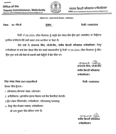 Malerkotla,15 June,2024,(Azad Soch News):- ਮਾਲੇਰਕੋਟਲਾ ‘ਚ 17 ਜੂਨ ਨੂੰ ਈਦ-ਉਲ-ਜੁਹਾ (ਬਕਰੀਦ) (Eid-ul-Juha (Bakrid)) ਦੇ ਤਿਉਹਾਰ ਦੇ ਮੱਦੇਨਜ਼ਰ ਛੁੱਟੀ ਦਾ ਐਲਾਨ ਕੀਤਾ ਗਿਆ ਹੈ,ਇਸ ਸਬੰਧੀ ਡੀਸੀ (DC) ਵੱਲੋਂ ਲਿਖਤੀ ਹੁਕਮ ਵੀ ਜਾਰੀ ਕਰ ਦਿੱਤੇ ਗਏ ਹਨ।