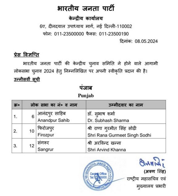 New Delhi,08 May,2024,(Azad Soch News):- ਭਾਜਪਾ ਨੇ ਪੰਜਾਬ ਵਿੱਚ 3 ਹੋਰ ਉਮੀਦਵਾਰਾਂ ਦੀ ਇੱਕ ਹੋਰ ਸੂਚੀ ਜਾਰੀ ਕਰ ਦਿੱਤੀ ਹੈ,ਦੱਸ ਦਈਏ ਕਿ ਸ੍ਰੀ ਅਨੰਦਪੁਰ ਸਾਹਿਬ ਜੀ (Shri Anandpur Sahib Ji) ਤੋਂ ਡਾ ਸੁਭਾਸ਼ ਸ਼ਰਮਾ, ਫਿਰੋਜ਼ਪੁਰ ਤੋਂ ਰਾਣਾ ਗੁਰਮੀਤ ਸਿੰਘ ਸੋਢੀ ਅਤੇ ਸੰਗਰੂਰ ਤੋਂ-ਅਰਵਿੰਦ ਖੰਨਾ ਦੇ ਨਾਵਾਂ ਦਾ ਐਲਾਨ ਕੀਤਾ ਗਿਆ ਹੈ।