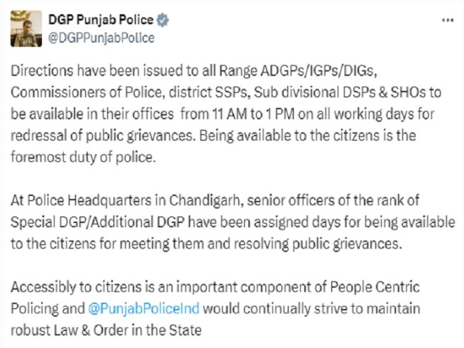 Chandigarh,09 June,2024,(Azad Soch News):- ਡੀਜੀਪੀ ਪੰਜਾਬ ਗੌਰਵ ਯਾਦਵ (DGP Punjab Gaurav Yadav) ਨੇ ਪੁਲਿਸ ਅਧਿਕਾਰੀਆਂ ਨੂੰ ਹਦਾਇਤ ਕੀਤੀਹੈ,ਕਿ ਉਹ ਲੋਕਾਂ ਵਾਸਤੇ ਆਪਣੇ ਦਫਤਰਾਂ ਵਿਚ ਸਵੇਰੇ 11.00 ਵਜੇ ਤੋਂ ਦੁਪਹਿਰ 1.00 ਵਜੇ ਤੱਕ ਉਪਲਬਧ ਰਹਿਣ,ਇਹ ਹਿਦਾਇਤ ਸਾਰੇ ਜਿਲ੍ਹਿਆਂ ਦੇ DSP ਪੱਧਰ ਤਕ ਦੇ ਅਫ਼ਸਰਾਂ ਤੋਂ ਲੈਕੇ ਸਟੇਟ ਹੈਡਕਵਾਰਟਰ ਤੇ DGP ਪੱਧਰ ਦੇ ਸਾਰੇ ਅਫ਼ਸਰਾਂ ਲਈ ਜਾਰੀ ਕੀਤੀਆਂ ਗਈਆਂ ਹਨ,ਇਸ ਸਬੰਧੀ ਹੁਕਮ ਡੀਜੀਪੀ ਪੰਜਾਬ ਗੌਰਵ ਯਾਦਵ ਵੱਲੋਂ ਦਿੱਤੇ ਗਏ ਹਨ,ਉਨ੍ਹਾਂ ਨੇ ਆਪਣੇ ਸੋਸ਼ਲ ਮੀਡੀਆ ਅਕਾਊਂਟ ਐਕਸ (Social Media Account X) ‘ਤੇ ਪੋਸਟ ਕਰਕੇ ਇਹ ਜਾਣਕਾਰੀ ਦਿੱਤੀ ਹੈ,ਲੋਕਾਂ ਵੱਲੋਂ ਆ ਰਹੀਆਂ ਸ਼ਿਕਾਇਤਾਂ ਦਾ ਤੁਰੰਤ ਨਿਪਟਾਰਾ ਕਰਨ ਲਈ ਡੀਜੀਪੀ ਪੰਜਾਬ ਗੌਰਵ ਯਾਦਵ ਵੱਲੋਂ ਇਹ ਫੈਸਲਾ ਲਿਆ ਗਿਆ ਹੈ।