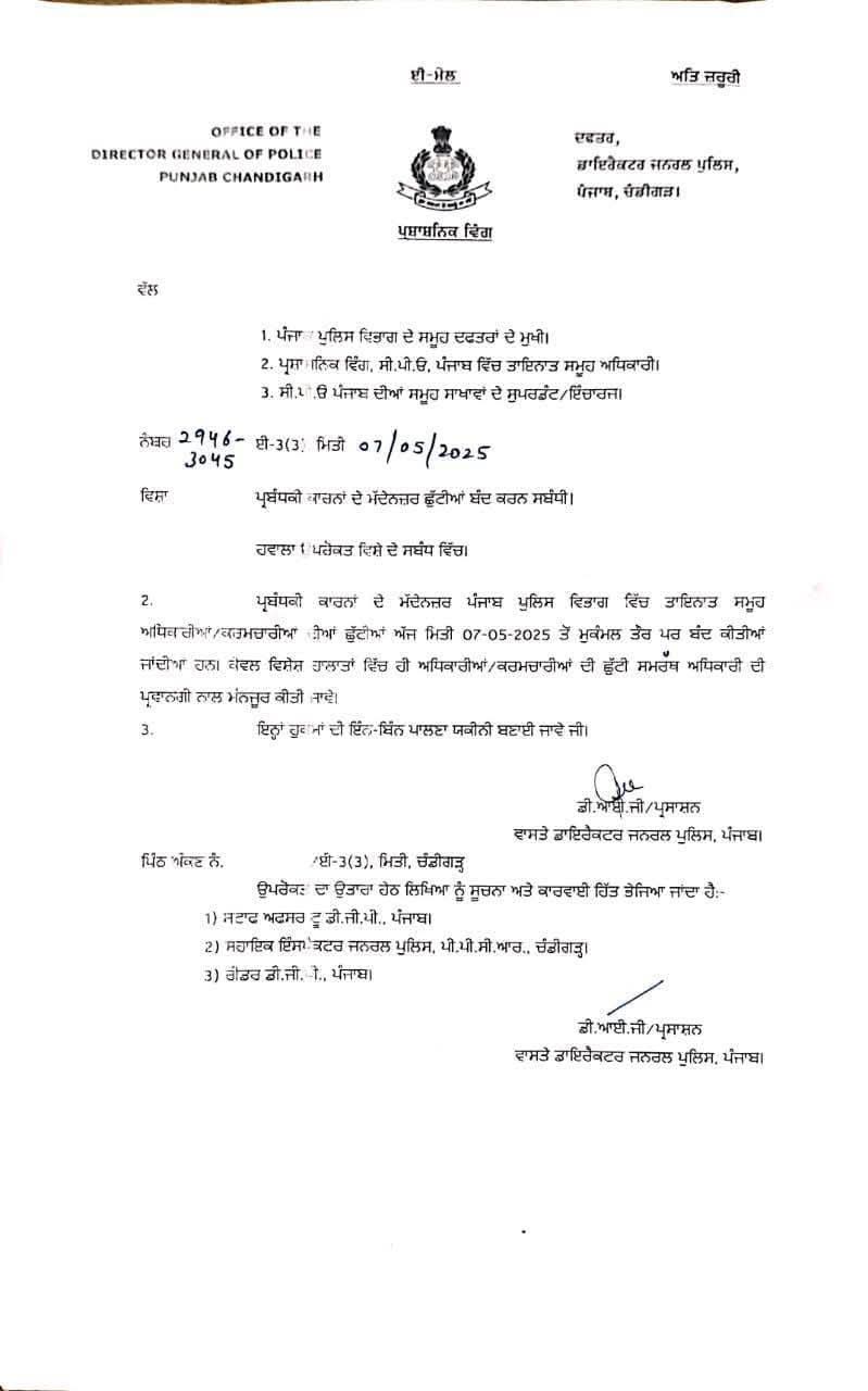 Chandigarh, 08,MAY,2025,(Azad Soch News):- ਪੰਜਾਬ ਪੁਲਿਸ ਨੇ ਸਾਰੇ ਮੁਲਾਜ਼ਮਾਂ ਲਈ ਛੁੱਟੀਆਂ ਰੱਦ ਕਰ ਦਿੱਤੀਆਂ ਹਨ। ਦੇਸ਼ ਵਿਚ ਚਲ ਰਹੇ ਹਾਲਾਤਾਂ ਦੇ ਮੱਦੇਨਜ਼ਰ ਇਹ ਫੈਸਲਾ ਲਿਆ ਗਿਆ ਹੈ।