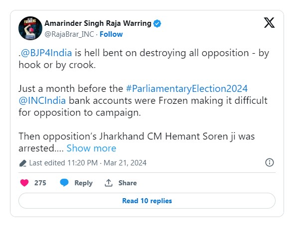 ਪੰਜਾਬ ਕਾਂਗਰਸ ਦੇ ਪ੍ਰਧਾਨ ਅਮਰਿੰਦਰ ਰਾਜਾ ਵੜਿੰਗ ਨੇ ਦਿੱਲੀ ਦੇ ਮੁੱਖ ਮੰਤਰੀ ਅਰਵਿੰਦ ਕੇਜਰੀਵਾਲ ਦੀ ਗ੍ਰਿਫਤਾਰੀ ਦੀ ਨਿਖੇਧੀ ਕੀਤੀ