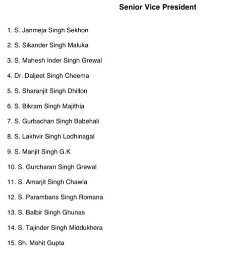 ਸ਼੍ਰੋਮਣੀ ਅਕਾਲੀ ਦਲ ਦੇ ਪ੍ਰਧਾਨ ਸੁਖਬੀਰ ਸਿੰਘ ਬਾਦਲ ਵੱਲੋਂ ਅਕਾਲੀ ਦਲ ਦੇ 15 ਸੀਨੀਅਰ ਮੀਤ ਪ੍ਰਧਾਨਾਂ ਦੀ ਸੂਚੀ ਦਾ ਐਲਾਨ
